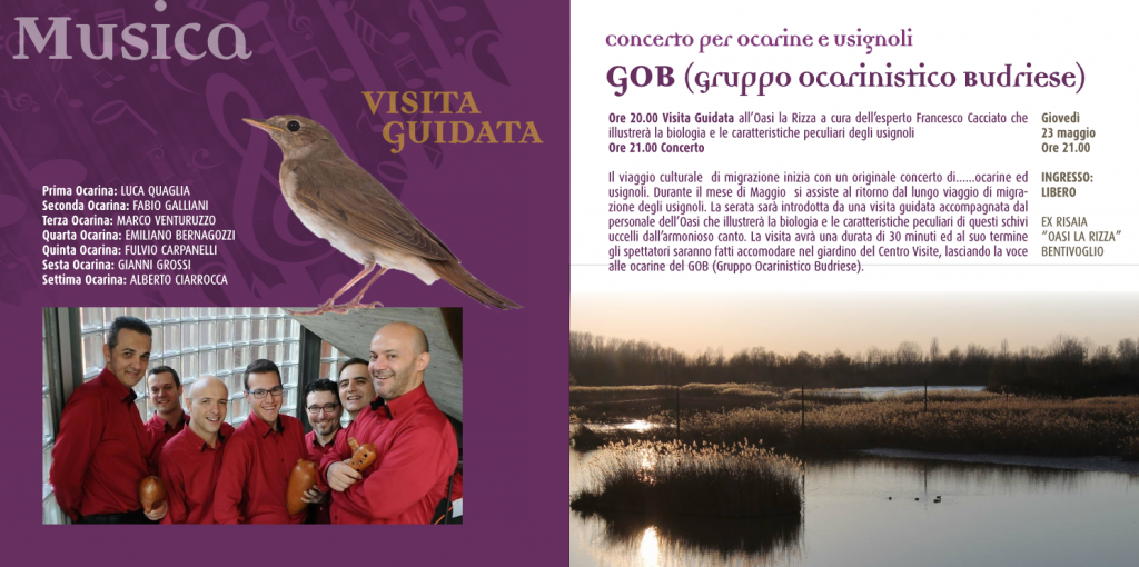 Il viaggio culturale di migrazione inizia con un originale concerto di……ocarine ed usignoli. Durante il mese di Maggio si assiste al ritorno dal lungo viaggio di migrazione degli usignoli. La serata sarà introdotta da una visita guidata accompagnata dal personale dell’Oasi che illustrerà la biologia e le caratteristiche peculiari di questi schivi uccelli dall’armonioso canto. La visita avrà una durata di 30 minuti ed al suo termine gli spettatori saranno fatti accomodare nel giardino del Centro Visite, lasciando la voce alle ocarine del GOB (Gruppo Ocarinistico Budriese).