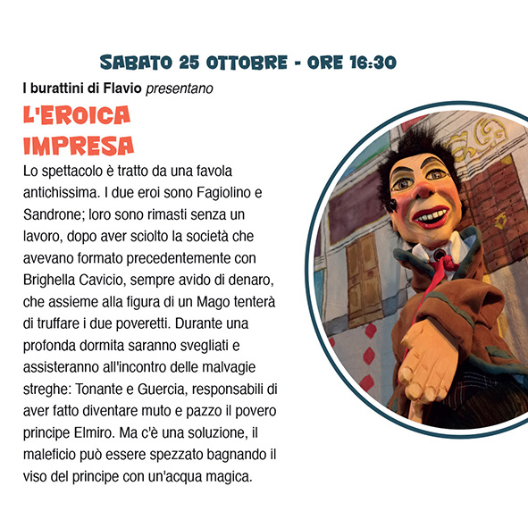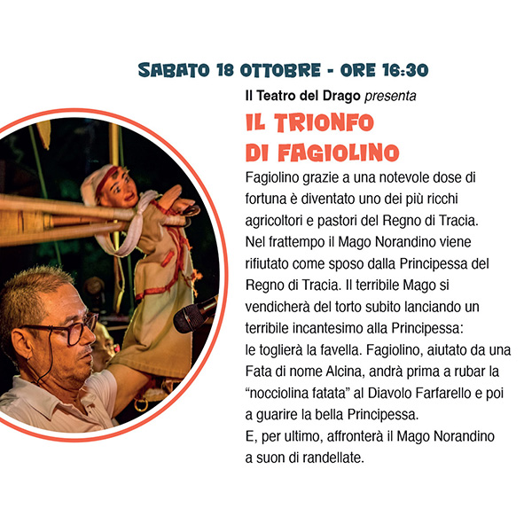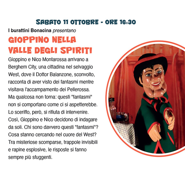 La Compagnia degli Sbuffi presenta Burattini PULCINELLA E LA CASA MAGICA SABATO 4 OTTOBRE - ORE 16:30 Centro culturale tE:Ze, via Berlinguer 7 – Bentivoglio BO Pulcinella Citrullo si innamora della bella Teresina, figlia del locandiere Don Pancrazio Codadivacca e promessa sposa del giovane proprietario terriero Don Felice Sciosciammocca, pensionante della locanda. Pulcinella, travestito da…