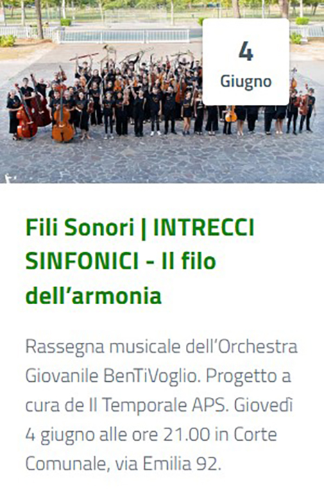 Rassegna musicale dell’Orchestra Giovanile BenTiVoglio Fili Sonori INTRECCI SINFONICI Giovedì 4 giugno alle ore 21.00 Corte Comunale, via […]
