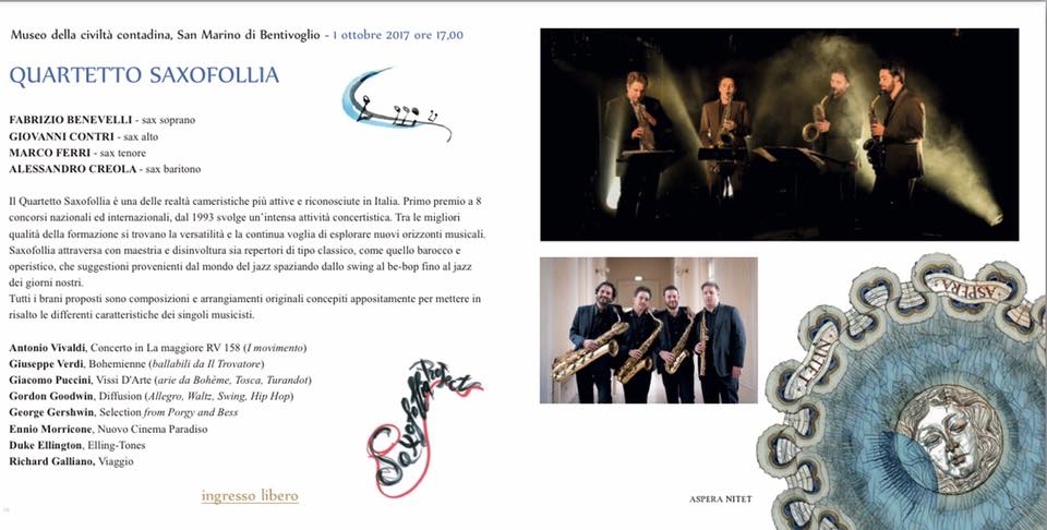 FABRIZIO BENEVELLI - sax soprano GIOVANNI CONTRI - sax alto MARCO FERRI - sax tenore ALESSANDRO CREOLA - sax baritono Antonio Vivaldi , Concerto in La maggiore RV 158 (I movimento) Giuseppe Verdi, Bohemienne (ballabili da Il Trovatore) Giacomo Puccini, Vissi d'Arte (arie da Bohème, Tosca, Turandot) Gordon Goodwin, Diffusion (Allegro, Waltz, Swing, Hip Hop) George Gershwin, Selection from Porgy and Bess Ennio Morricone , Nuovo Cinema Paradiso Duke Ellington, Elling-Tones Richard Galliano, Viaggio![]()