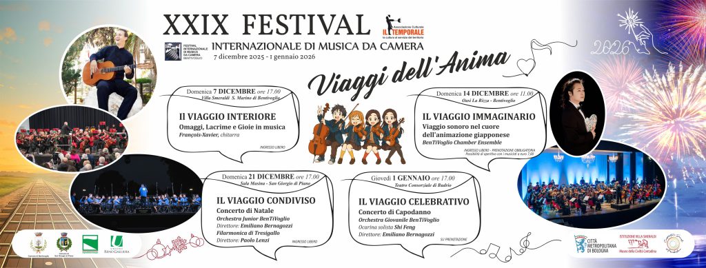 Quest’anno il Festival ci invita a un grande viaggio: quattro tappe, quattro mondi da attraversare, quattro modi diversi di ascoltare e vivere la musica. Un percorso che parte dall’intimità dell’anima, vola nella fantasia, si apre alla gioia condivisa e si conclude nella festa.
